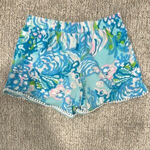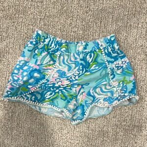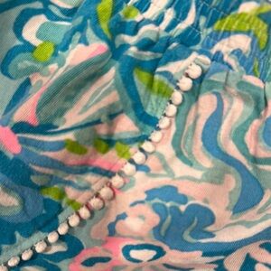 Vibrant shorts with a playful pattern. Features shades of blue, pink, and green.