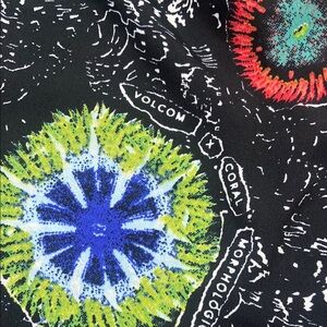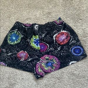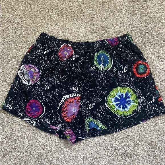 Vibrant shorts with a unique pattern. Features multiple colors on a black base. Perfect over a swim suit. Light a flowing