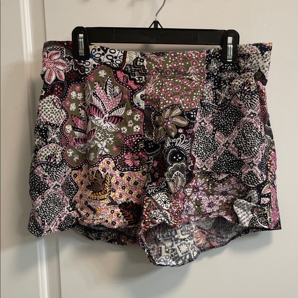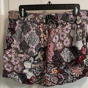 Vibrant patchwork shorts with a mix of floral and geometric patterns. Features shades of pink, green, and black. Elastic backside waistband.