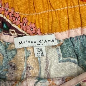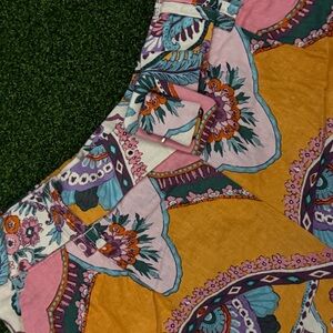 Vibrant shorts with a colorful pattern. Features pink, orange, and green hues.