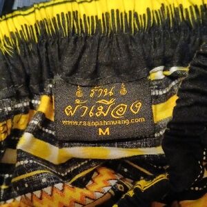 Vibrant skirt with intricate patterns. Features black, yellow, and orange colors.