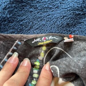 Vibrant sleeveless top with a colorful pattern. Features a mix of black, white, and multicolored floral designs. Vintage Jams World