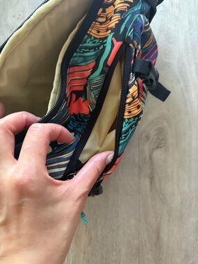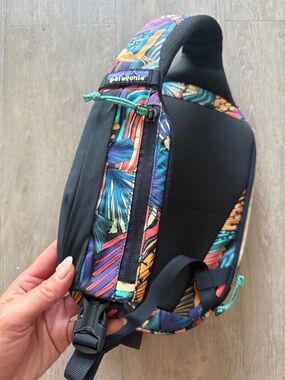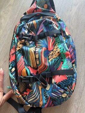 Vibrant multicolor sling backpack with bold abstract print. Single-strap design with padded back. Multiple exterior pockets and adjustable straps. Eye-catching everyday carry piece.