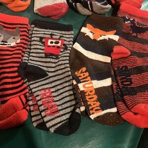 Set of 14 colorful patterned socks featuring various designs. Includes stripes, animals, and festive patterns. Day of the week. Perfect for adding fun to your wardrobe. Fits size 10-1
