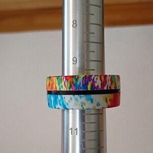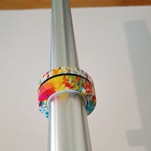 Vibrant ring with a multicolor pattern. Features shades of blue, pink, yellow, and black.