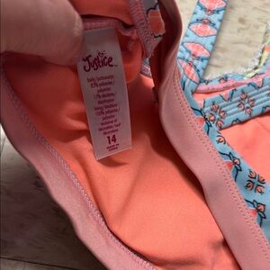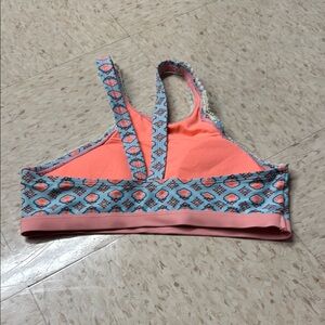 Vibrant sports bra with intricate patterns. Features a mix of colors for a stylish look. Perfect for workouts or casual wear.