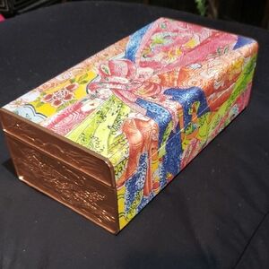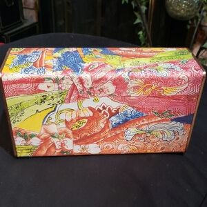 Very attractive vibrant storage box with intricate patterns. Features red, blue, yellow, and green designs.
