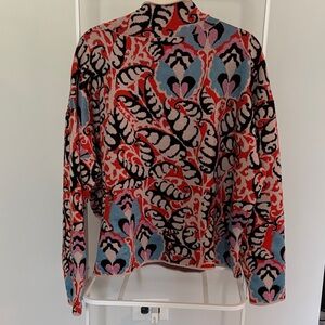 Carys mock-neck sweater. Features red, black, pink, and blue colors. Maeve by Anthropologie. Limited edition pattern. Some pulling on back right shoulder.
