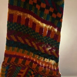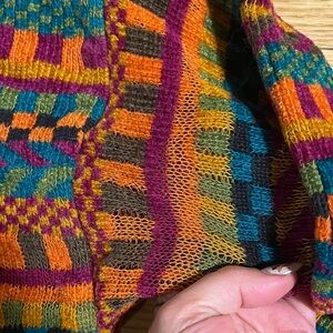 Stay warm and stylish with this vibrant sweater. Featuring a colorful pattern, it's perfect for adding a pop of color to your wardrobe. There are some areas on the sleeves of the sweater that are sheer, see photos