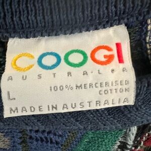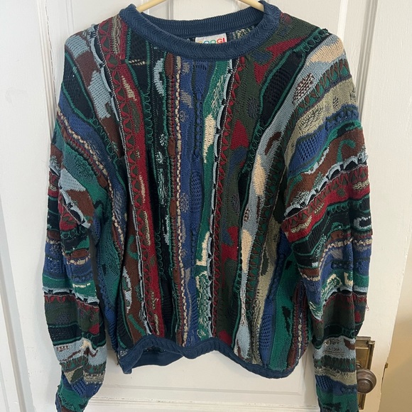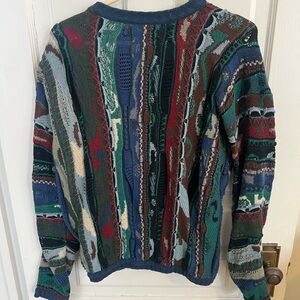 Bold COOGI sweater with intricate patterns. Features blue, green, red, and brown hues. Unique and eye-catching design. Dan Flashes vibes.