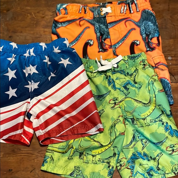 Set of three vibrant swim trunks featuring unique patterns. Includes American flag and dinosaur designs. Perfect for a fun day at the beach.