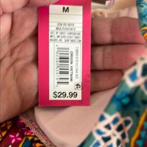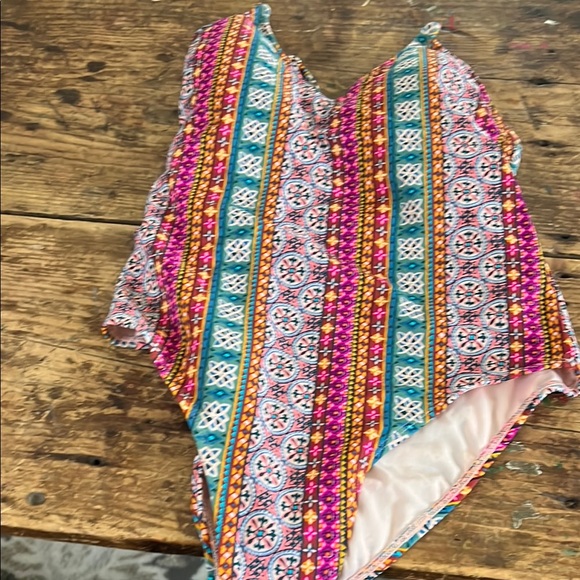 Vibrant one-piece swimsuit with a colorful pattern. Features pink, blue, and orange hues.