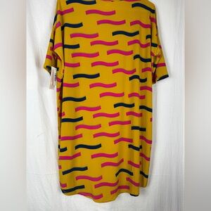 Vibrant t-shirt with pink, blue, and yellow wave patterns. Perfect for a bold look.
