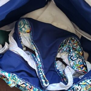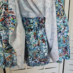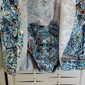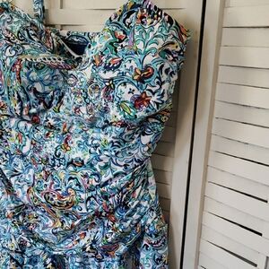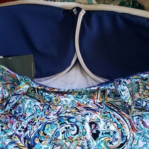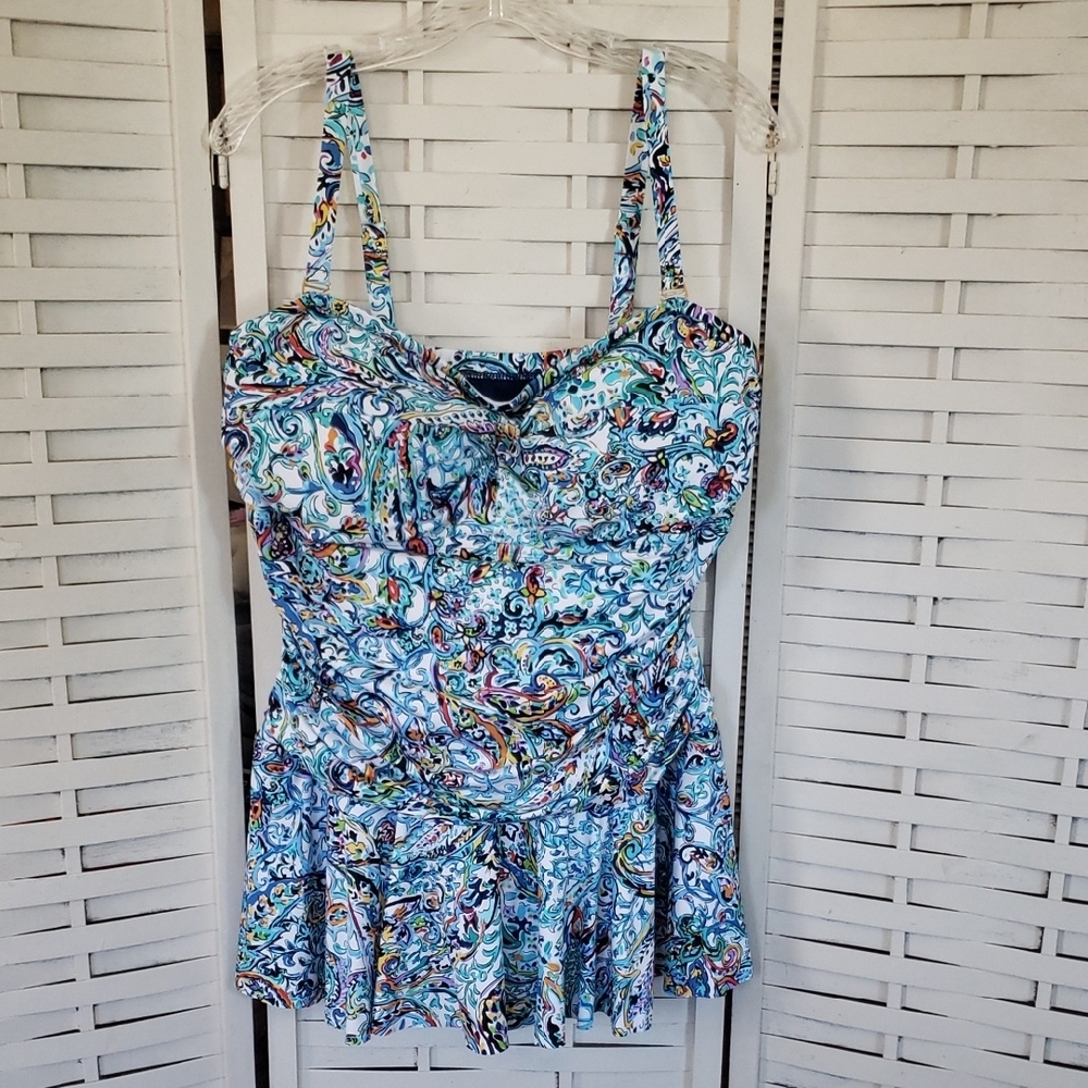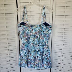 Vibrant tankini top with a colorful pattern. Features adjustable straps and a flattering fit.