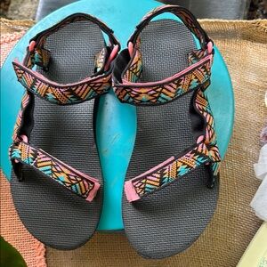 Vibrant sandals with a colorful geometric pattern. Mild wear with some scuffing around the toes.