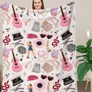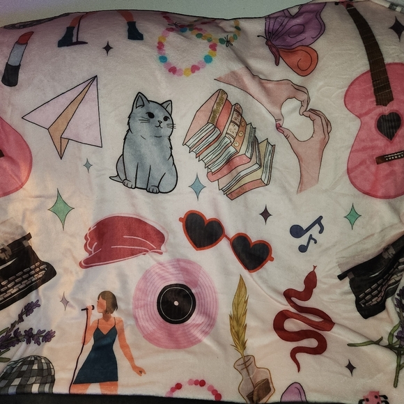 This is a soft, plush throw blanket featuring illustrations related to Taylor Swift's musical "eras". Featuring 60 by 80 inches of soft, silky, and cuddly warmth.