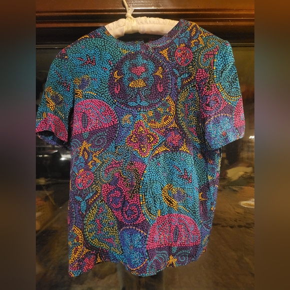 Vibrant top with intricate mosaic patterns. Features blue, pink, and yellow colors. Bring the funky and fun to wherever you are