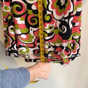 Vibrant top with a bold pattern. Features red, green, and black swirls. Perfect for a statement look.