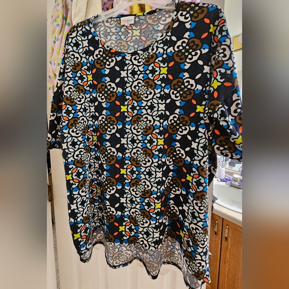 Vibrant top with intricate floral patterns. Features a mix of blue, brown, black, and white colors. This top is soft and so comfortable.