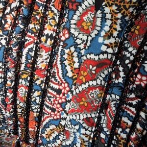 Vibrant top with intricate patterns. Features a mix of colors including red, blue, and orange.