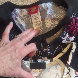 A lot of Small Scrub tops, last picture has an XS and a M, featuring floral and abstract designs. Includes shades of pink, black, blue, and white, if you want more pictures let me know.