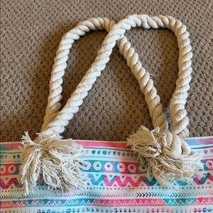 This stylish tote bag features a vibrant pattern with blue accents and sturdy rope handles. Perfect for adding a pop of color to any outfit or taking it to the beach. Never used.