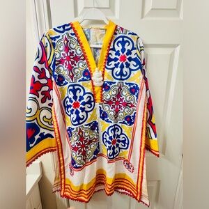 Vibrant tunic with intricate patterns. Features red, blue, yellow, and white colors. Perfect for a bold look.