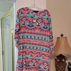 Vibrant dress with a mix of pink, blue, and green patterns. Perfect for a lively look.