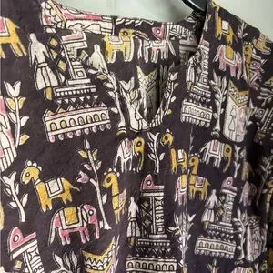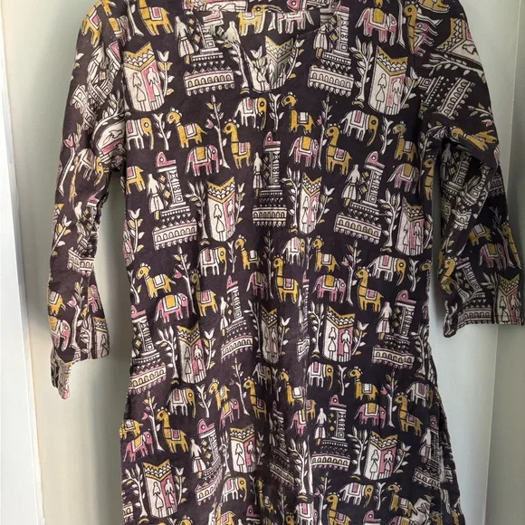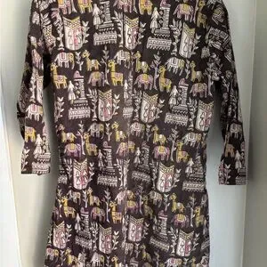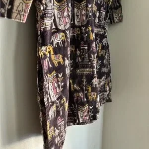 This vibrant tunic features a playful pattern in shades of black, pink, and yellow. Two slits exist on the side of this thick material tunic.