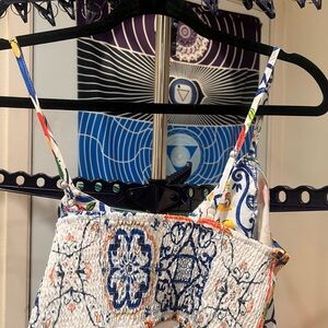 Vibrant two-piece set with a colorful pattern. Features a sleeveless cropped V-neck top and matching maxi skirt. Vacation, Travel, Boho