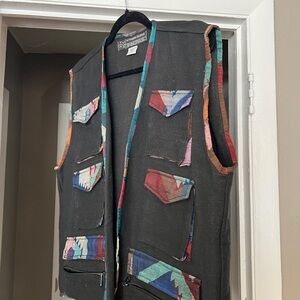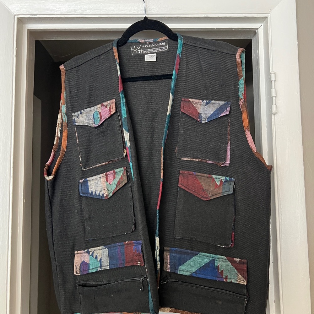 Colorful patchwork vest with black base by A People United. Multiple pockets, quilted trim, and a bold statement style.