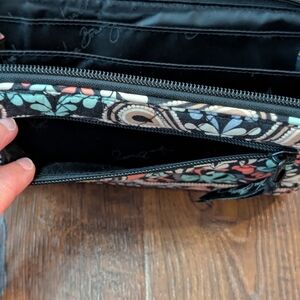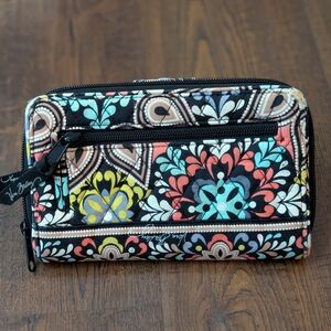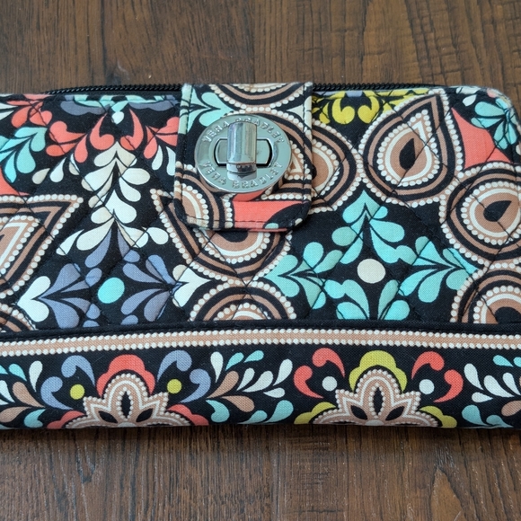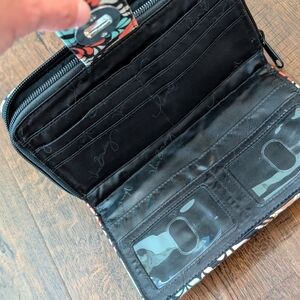 Vibrant wallet with intricate patterns. Features a mix of colors. This zip around wallet has multiple places for cards and bills and a zipper on the back for change.