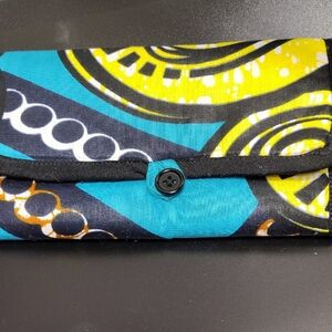 Vibrant clutch featuring a bold pattern in blue, yellow, and black. Secured with a button closure.