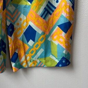Step out in style with this colorful wide leg silky pants, showcasing a lively pattern in blue, orange, and green. Ideal for a chic and vibrant look. 24 inches length.