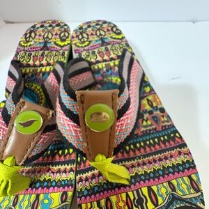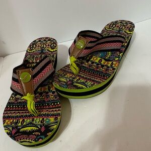 Sakroots Peace Wedge Flip Flop Sandals identifiable by their distinctive colorful, peace-sign inspired pattern and wedge heel. Wedge flip-flop sandals, featuring a raised heel for added elevation and comfort.