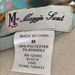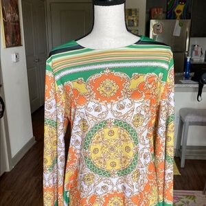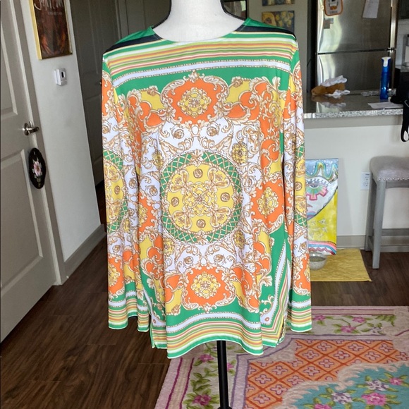 Vibrant women's top featuring a colorful pattern with green, orange, and yellow hues. Perfect for adding a pop of color to your wardrobe.