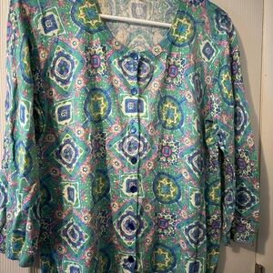 Vibrant women's top featuring a colorful pattern. Perfect for adding a pop of color to your wardrobe.