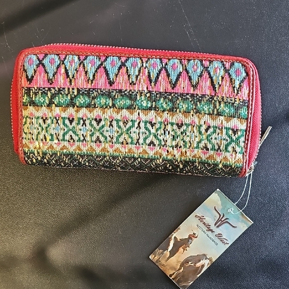 This vibrant women's wallet features a striking multicolor pattern, perfect for adding a pop of color to your accessories. The wallet combines shades of pink, green, and black, making it a stylish choice for any occasion.