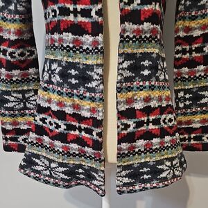 Vibrant open coat with a western/winter pattern. Features red, black, and white colors.