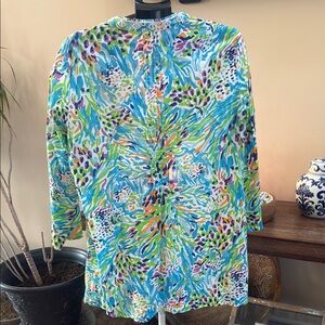 Bright tunic with intricate embroidery. Features vibrant shades of blue, green, and orange. Ideal for a stylish day out. Excellent used condition, no pilling, stains or runs. Smoke free/pet free home. Size XL