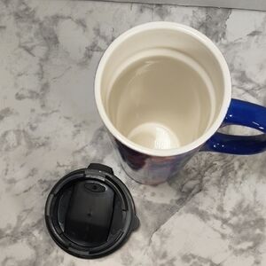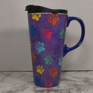 Vibrant travel mug with colorful paw prints. Features a secure black lid and handle. pre-owned good condition