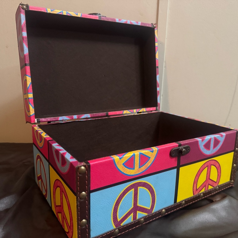 Add a pop of color and retro flair to your space with this vibrant storage box! Featuring bold peace sign graphics in a Warhol-inspired grid, this chest is both functional and fun. Perfect for storing keepsakes, crafts, or accessories. Sturdy construction with a secure latch closure and vintage-style rivets.