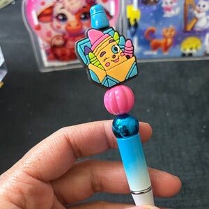 This vibrant pen features a playful character topper, perfect for adding fun to writing activities. The pen showcases a mix of blue and pink colors, making it a delightful choice for kids.