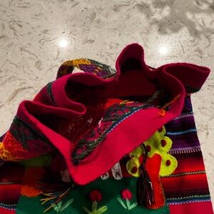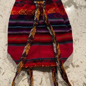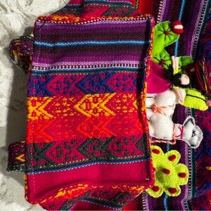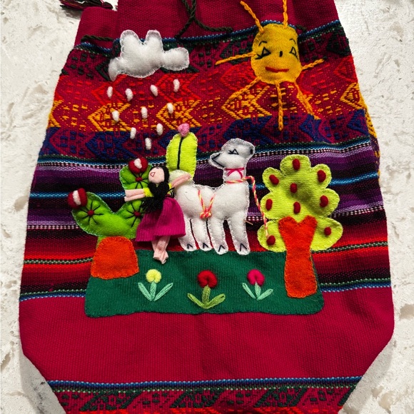 Vibrant drawstring bag with intricate embroidery. Features a playful scene with animals and nature. Perfect for play or light items. New.