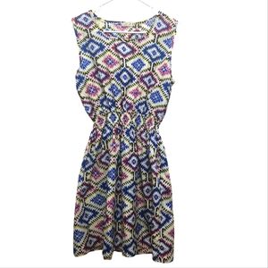 This vibrant dress features a stunning geometric tribal print in blue, pink, and green. Perfect for any occasion, it offers a stylish and comfortable fit.