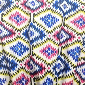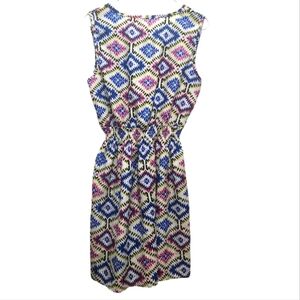 This vibrant dress features a stunning geometric tribal print in blue, pink, and green. Perfect for any occasion, it offers a stylish and comfortable fit.