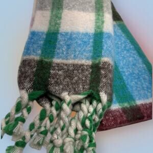 Cozy plaid scarf with fringe. Features green, blue, and red colors.
