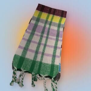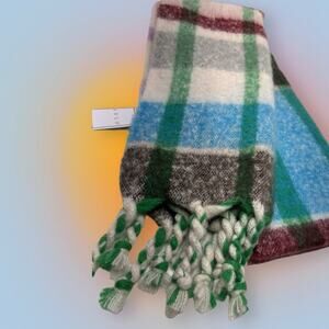 Cozy plaid scarf with fringe. Features green, blue, and red colors. NEW WITH TAG LULU MEASURES APPROX 78” length (not including fringe) x 16” width. Has a wool like appearance, but it’s 100% polyester.