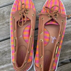 Step out in style with these vibrant plaid boat shoes. Featuring a mix of pink and orange hues, these shoes are perfect for adding a pop of color to any outfit. The comfortable design ensures all-day wearability.