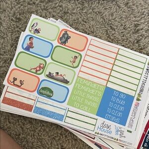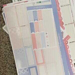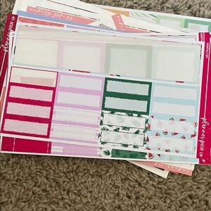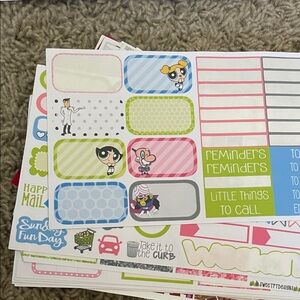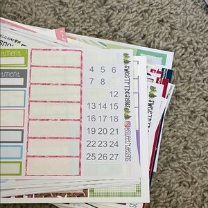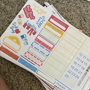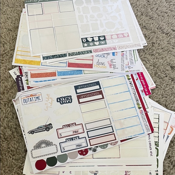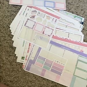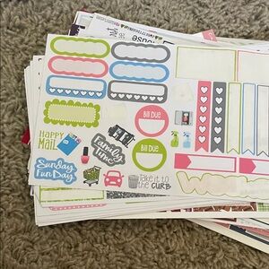 Assorted planner sticker sheets with various designs and colors. Perfect for organizing and decorating planners.